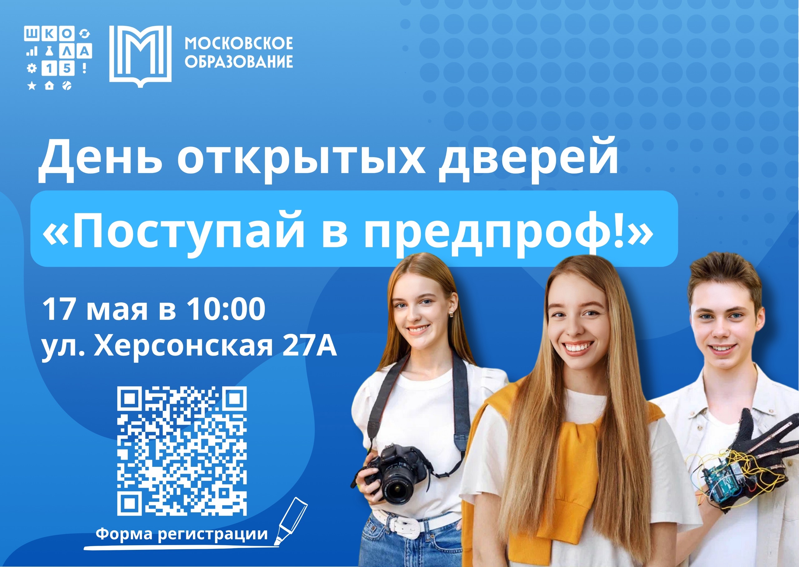 Приглашаем вас на День открытых дверей «Поступай в предпроф!», который состоится 17 мая в 10:00 по адресу: ул. Херсонская, 27А.
